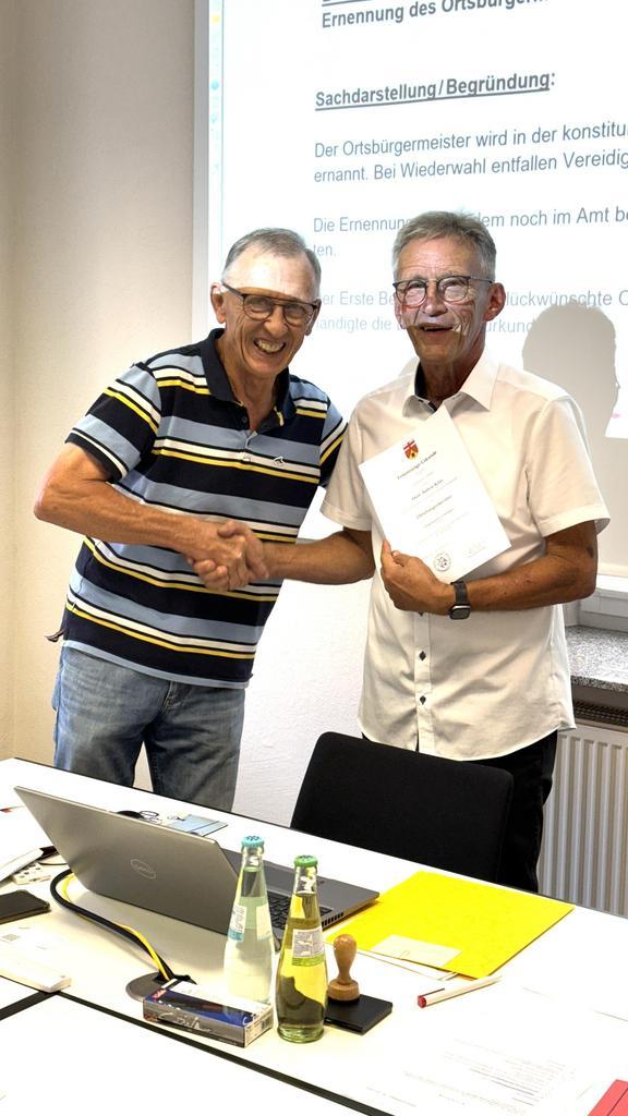 In einem weiteren Tagesordnungspunkt wurden in geheimer Abstimmung die Beigeordneten Jörg Marbach (I. Beigeordneter) und Rudolf Hoffmann (Beigeordneter) gewählt, vereidigt und ins Amt eingeführt.