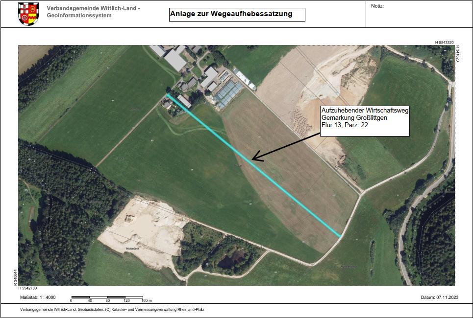 Der im Flurbereinigungsverfahren Großlittgen, Az.: G.6059-02, ausgewiesene Wirtschaftsweg in der Gemarkung Großlittgen Flur 13, Parz. Nr. 22 wird daher aufgehoben. Ein Lageplan mit der farblichen Darstellung des aufgehobenen Wegeabschnittes ist der Satzung als Anlage beigefügt.